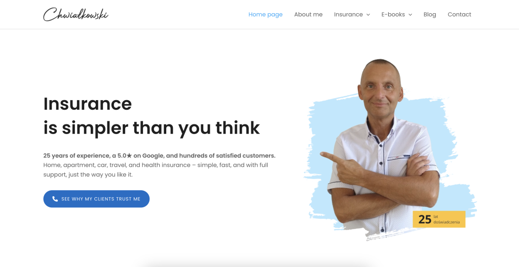 I wanted a clean, modern site that felt light and personal, yet reflected my experience and professionalism. My brand – Ubezpieczenia Grzegorz Chwiałkowski – needed to make people feel comfortable and informed. Not overwhelmed.