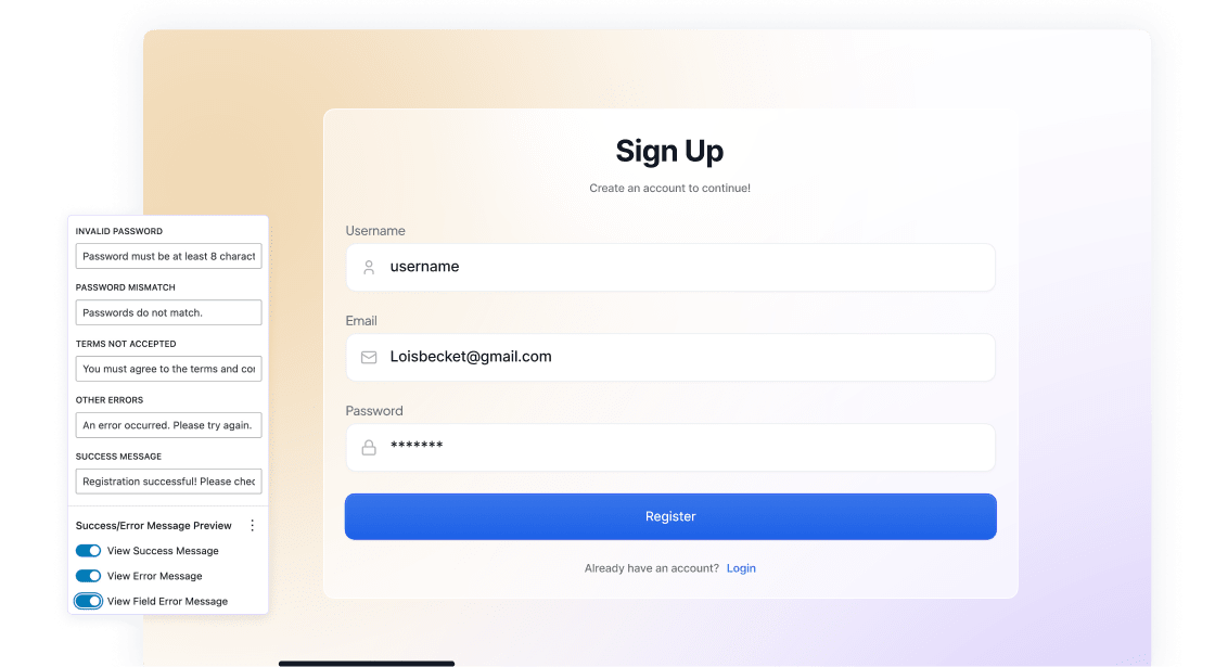 Build beautiful unique registration forms. Spectra gives you control over the fields, layout, color, size and every part of the form.