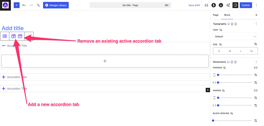 - The block automatically creates 3 accordion items to start