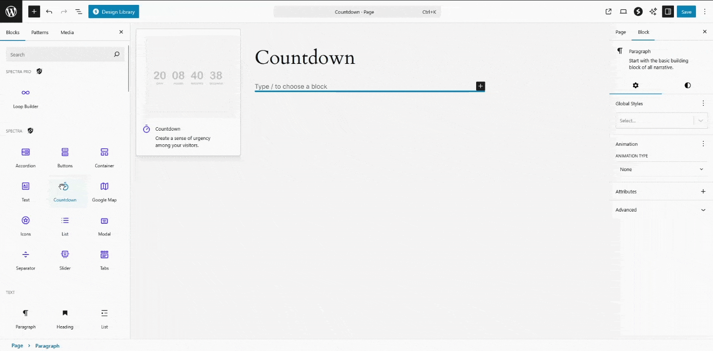 The block automatically creates a 7-day countdown. Set your target date in the “End Date & Time” setting and customize as needed.