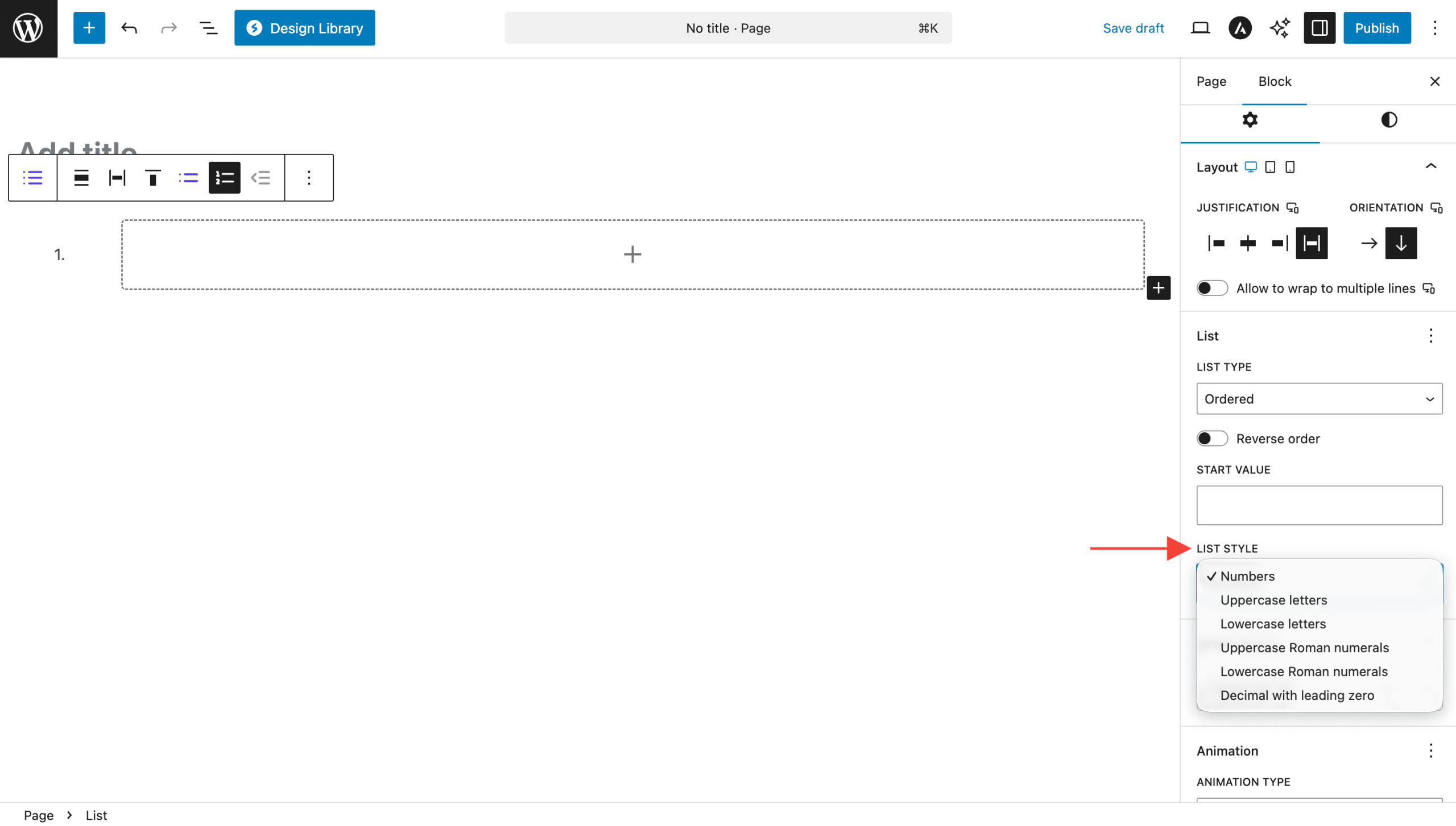 - For ordered lists: Select numbering style