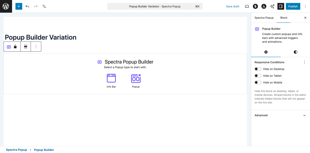 The Popup Builder Block is a comprehensive and versatile solution that enables you to create interactive popups and information bars to engage your website visitors. Perfect for displaying announcements, special offers, contact forms, newsletters, or any content that needs to capture attention and drive conversions. The Popup Builder features two distinct variations – popups for modal-style overlays and info bars for banner-style notifications – each with sophisticated customization options, responsive design, and advanced display controls.