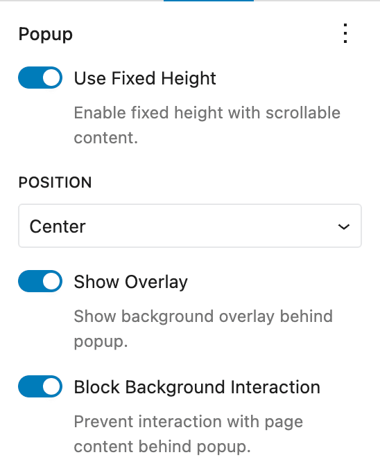 - Popup: Creates modal-style overlays that appear centered on the page with background overlay