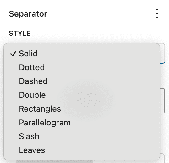 | Style | Separator appearance | Solid, Dotted, Dashed, Double, Rectangles, Parallelogram, Slash, Leaves |