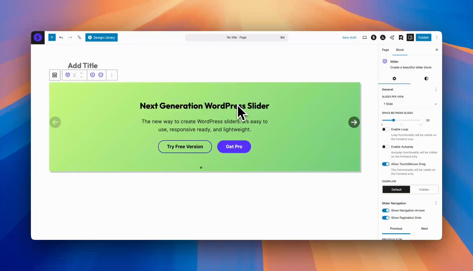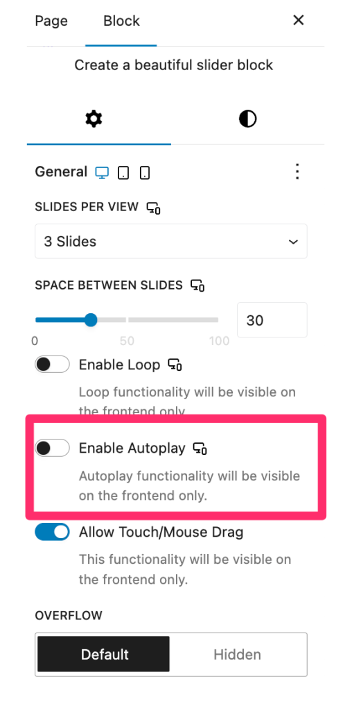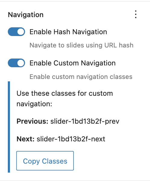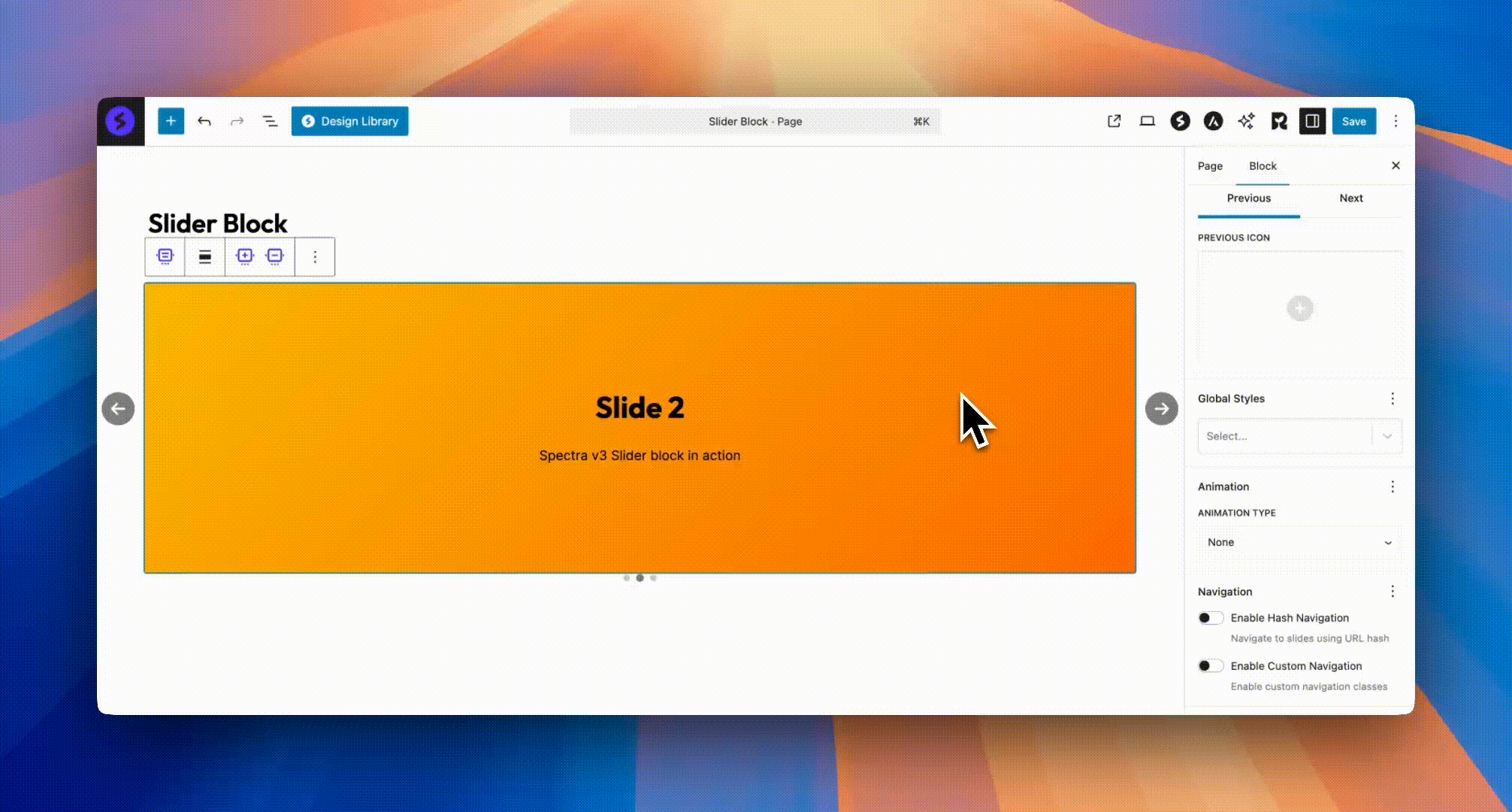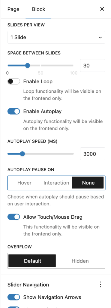 The Slider Block creates dynamic, responsive carousels for showcasing content, images, testimonials, or any combination of blocks. Built on the powerful Swiper.js library, it offers smooth transitions, touch support, and extensive customization options. Perfect for hero sections, product showcases, testimonial carousels, or any content that benefits from sequential presentation.