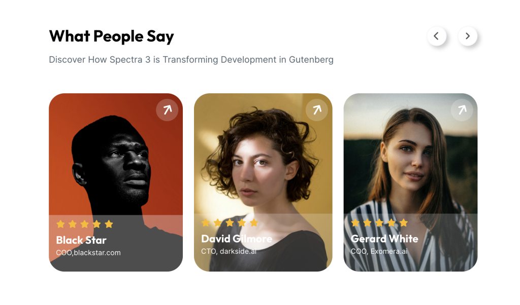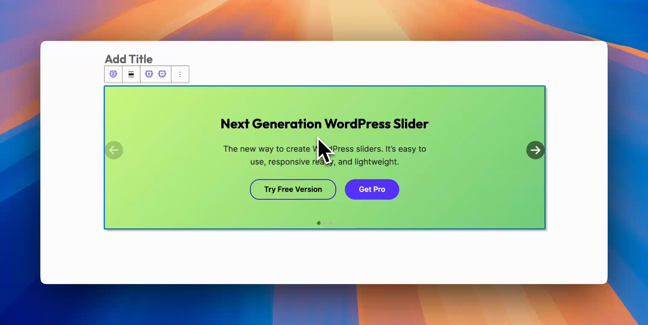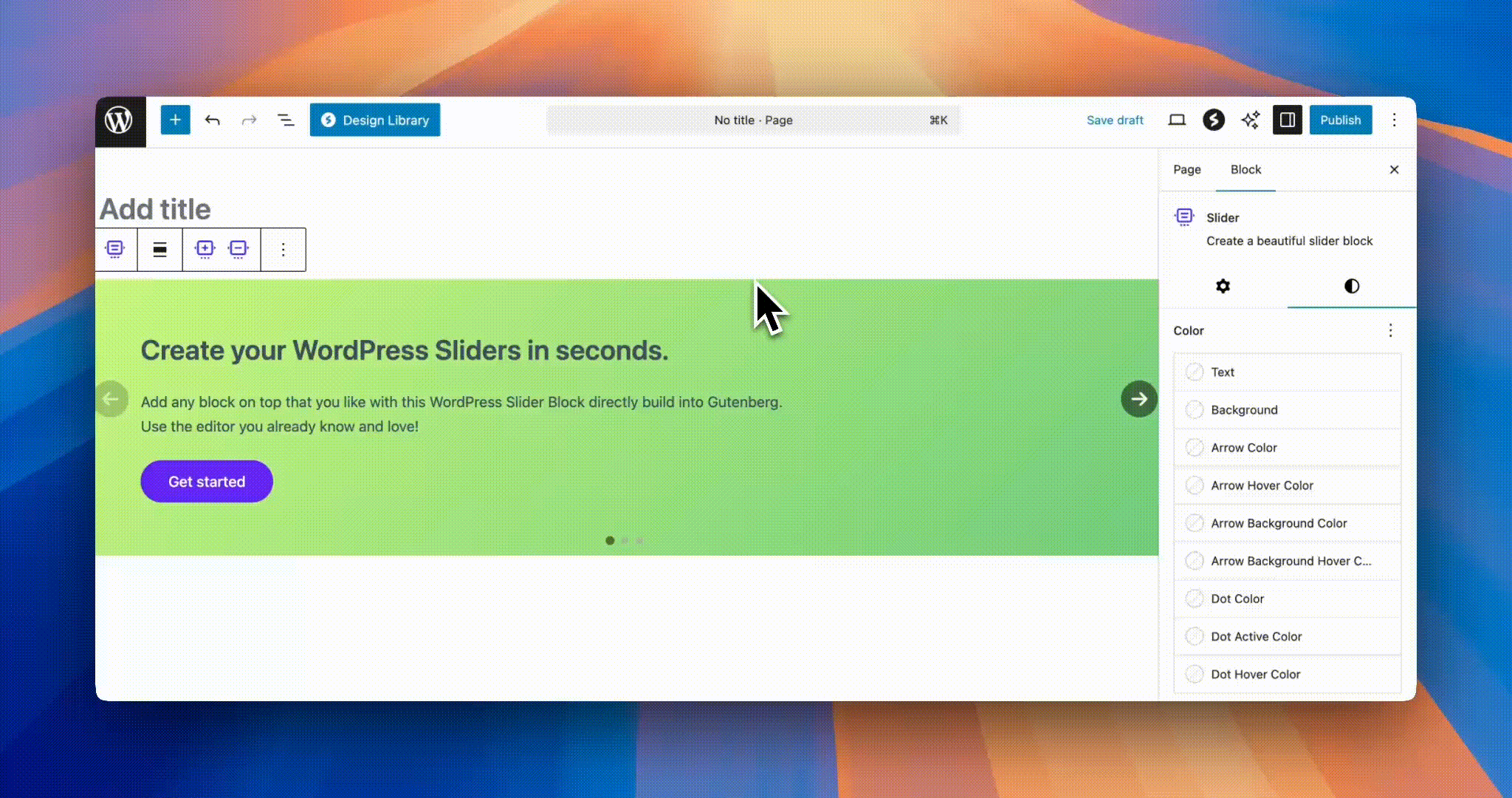 The Slider Block creates dynamic, responsive carousels for showcasing content, images, testimonials, or any combination of blocks. Built on the powerful Swiper.js library, it offers smooth transitions, touch support, and extensive customization options. Perfect for hero sections, product showcases, testimonial carousels, or any content that benefits from sequential presentation.