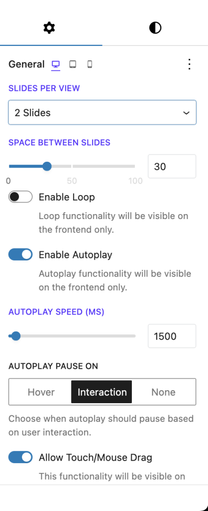| Slides Per View | Number of visible slides | 1, 2, 3, 4, Auto |